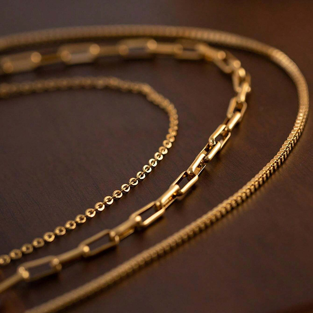 European Retro Brass Jewelry Three Layer Paperclip Chain Necklace with Stainless Steel and Titanium Rings