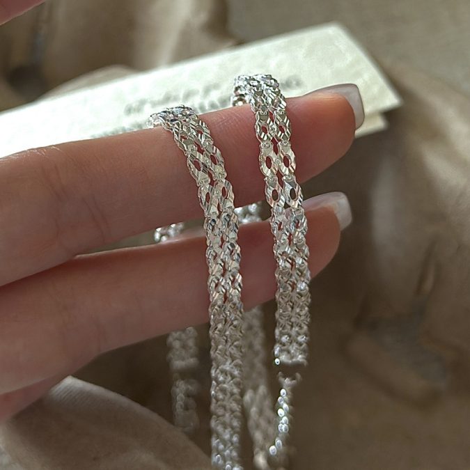 Elevate your style with our exquisite sterling silver jewelry double row geometric diamond lace weave bracelet a minimalist boho accessory designed for modern elegance Crafted with precision this trendy piece features a unique double row design intricately woven with geometric patterns that mimic delicate lacework The shimmering diamond accents add a touch of sophistication perfect for both casual and formal occasions Made from high quality sterling silver this bracelet combines durability with a lightweight feel ensuring lasting comfort Ideal for those who appreciate minimalist aesthetics with a bohemian twist this versatile silver jewelry piece effortlessly complements any outfit Celebrate contemporary craftsmanship and timeless beauty with a bracelet that captures the essence of sleek trendy design while embracing the allure of sterling silver jewelry
