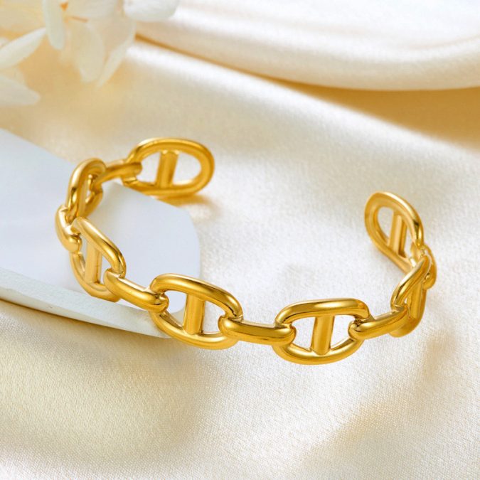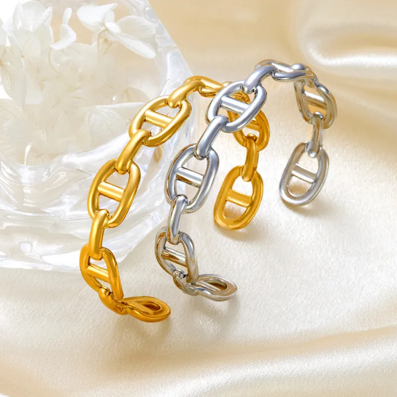 Stylish Silver Jewelry Retro Gold Plated Stainless Steel Wide C Shape Pig Nose Open Bangle Bracelet